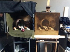 Emiatt a világításra különösen nagy hangsúlyt kell fektetnünk. Amikor elkezdjük beállítani a világítást, akkor a tárgyak világos oldala erős fényben fog fürödni, ahol csúcsfények keletkeznek. Ilyenkor, lehet, hogy úgy találjuk egy-egy tárgy színe, így megvilágítva már nem is felel meg nekünk a festményhez, és a tárgyat kihagyjuk, vagy kicseréljük a kompozícióból.